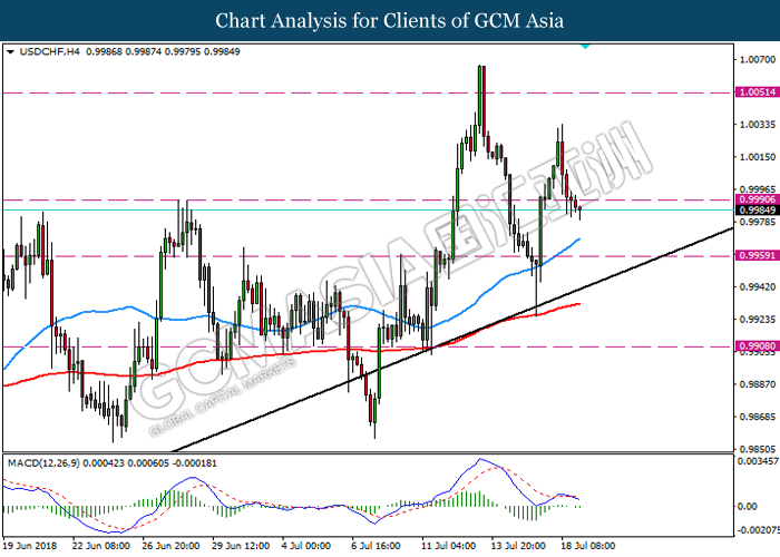 USDCHF, H4: USDCHF was trade lower while currently retest the resistance level 0.9990. MACD which illustrate signs of bearish bias addition with bearish divergence suggest the pair could extend its technical correction towards the support level 0.9960.