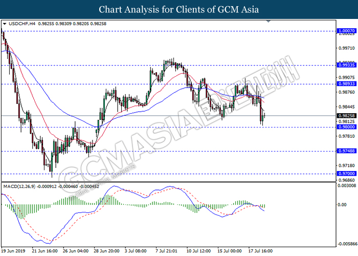 USDCHF, H4: USDCHF was traded lower while currently testing near the support level 0.9800. MACD which illustrate bearish momentum with death cross formation suggest the pair to extend its losses after successfully closing below the support level.
