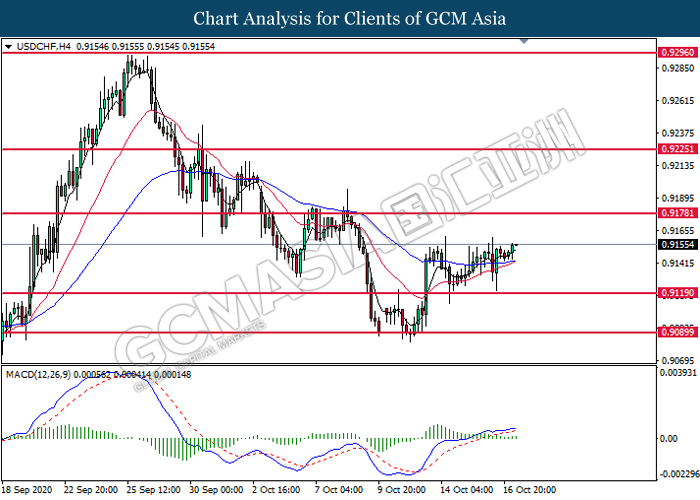 USDCHF, H4: USDCHF was traded higher following prior rebound from the support level at 0.9120. MACD which display bullish bias momentum bias momentum suggest the pair to extend its gains toward the resistance level at 0.9180.