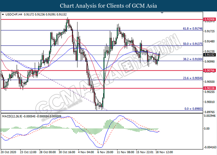 USDCHF, H4: USDCHF was traded higher following prior rebound from the support level near 0.9100. MACD which display diminishing bearish momentum signal suggest the pair to extend its rebound toward resistance level at 0.9135.