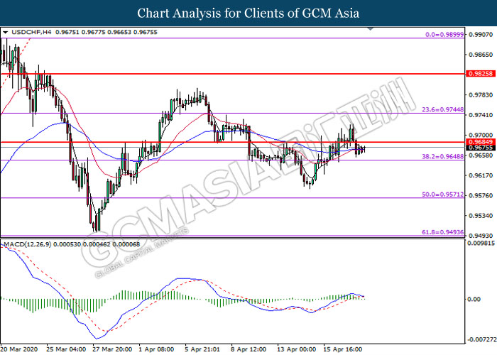 USDCHF, H4: USDCHF was traded higher following prior rebound from the lower level. However, MACD which illustrate diminishing bullish momentum suggest the pair to undergo technical correction toward the support level at 0.9650.