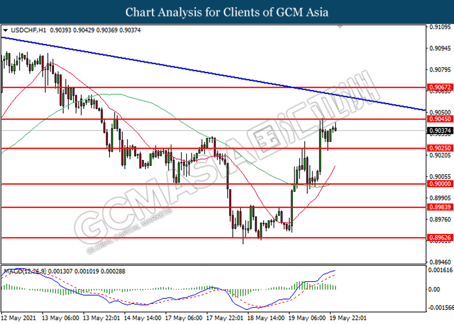 USDCHF, H1: USDCHF was traded higher following a rebound from the lower level. MACD which shows the formation of bullish signal suggest the pair to be traded higher after closing above 0.9045.