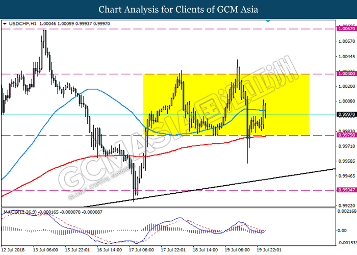USDCHF, H1: USDCHF remain traded in a consolidation following prior rebound from the support level 0.9980. MACD which illustrate bullish bias suggest the pair could be traded higher towards the resistance level 1.0030.