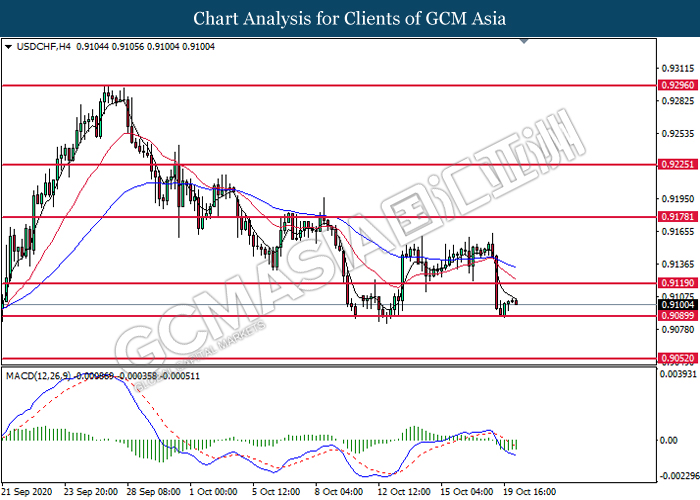 USDCHF, H4: USDCHF was traded higher following prior rebound from the support level at 0.9090. MACD which display diminishing bearish momentum signal suggest the pair to extend its gains toward the resistance level at 0.9120.