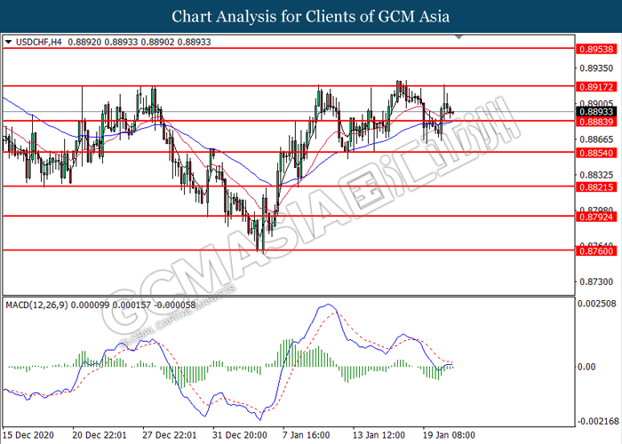 USDCHF, H4: USDCHF was traded lower following prior retracement from the resistance level at 0.8915. However, MACD which illustrated diminishing bearish momentum suggest the pair to undergo technical correction in short term toward higher level.