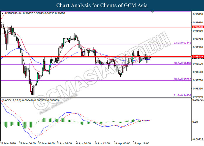 USDCHF, H4: USDCHF was traded higher while currently testing the resistance level at 0.9685. Due to lack of signal from MACD, it is suggested to wait for further confirmation before entering into the market.