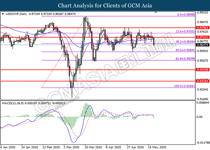 USDCHF, Daily: USDCHF was traded lower while currently testing the support level at 0.9660. MACD which illustrates bearish bias momentum suggest the pair to extend its losses after it successfully breakout below the support level.