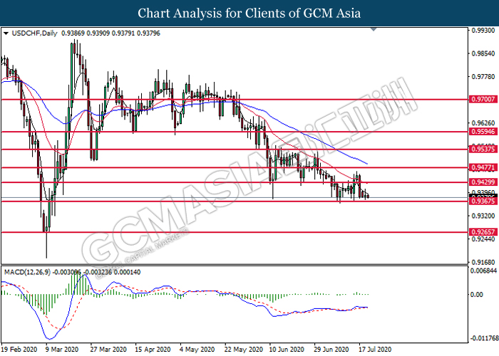 USDCHF, Daily: USDCHF was traded lower while currently testing the support level at 0.9365. MACD which illustrate diminishing bullish momentum suggest the pair to extend its losses after it successfully breakout below the support level at 0.9365.