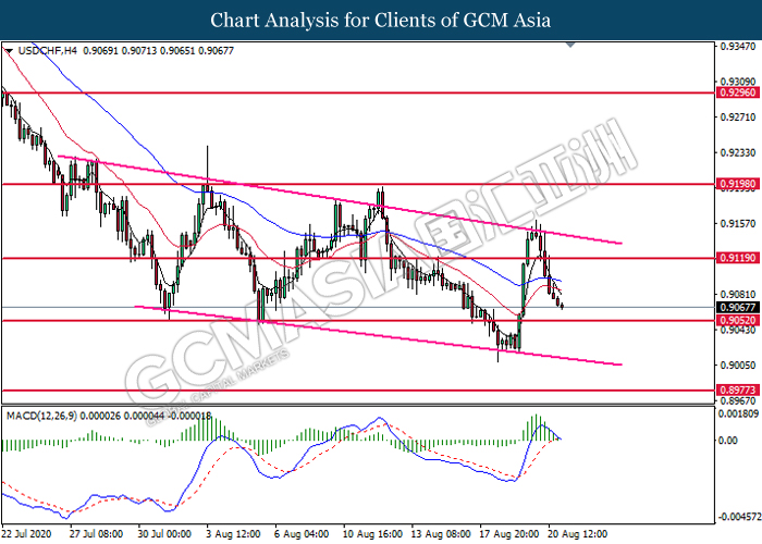USDCHF, H4: USDCHF was traded lower following prior breakout below the previous support level at 0.9120. MACD which illustrate diminishing bullish momentum signal suggest the pair to extend its losses toward the support level at 0.9050.
