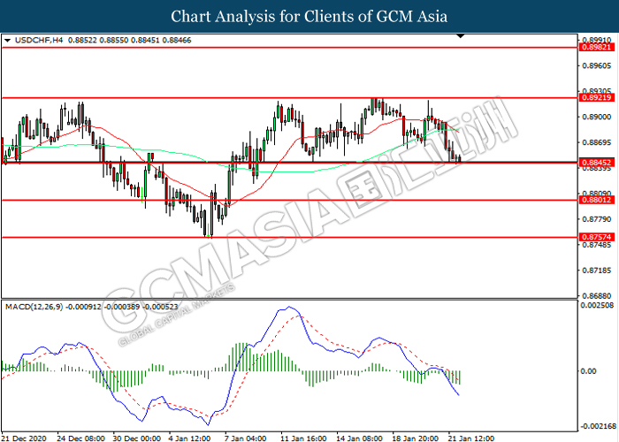 USDCHF, H4: USDCHF was traded lower while currently testing the support level at 0.8845. MACD which illustrated increasing bearish momentum suggest the pair to extend its losses after it successfully breakout below the support level.