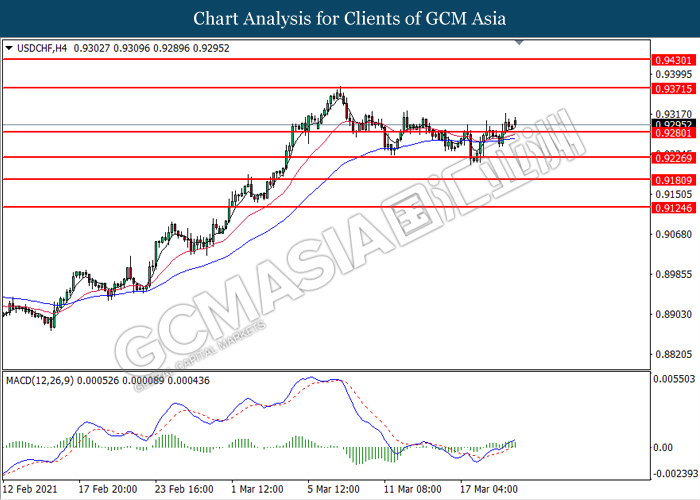 USDCHF, H4: USDCHF was traded higher following prior breakout above the previous resistance level at 0.9280. MACD which illustrated bullish bias momentum suggest the pair to extend its gains toward the resistance level at 0.9370.