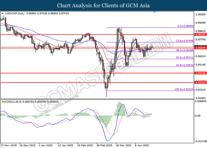 USDCHF, Daily: USDCHF was traded higher following prior breakout above the resistance level at 0.9685. MACD which illustrate diminishing bearish momentum with the formation of golden cross suggest the pair to extend its gains toward the resistance level at 0.9745.