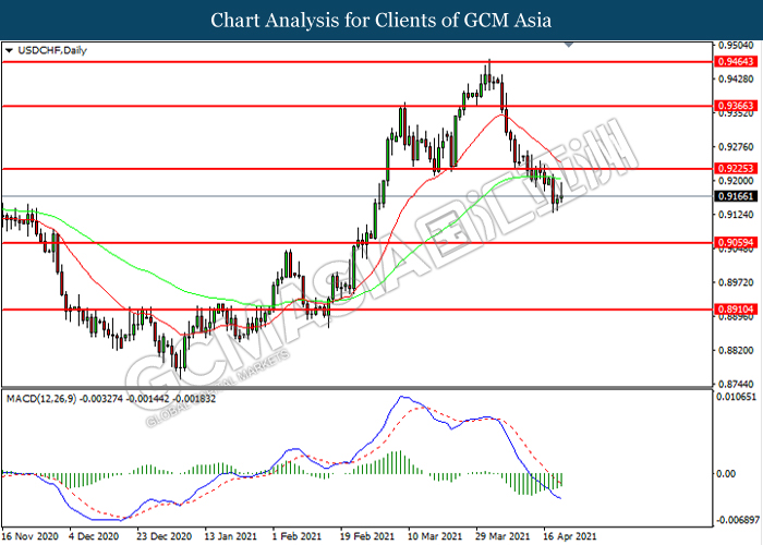 USDCHF, Daily: USDCHF was traded lower following prior breakout below the previous support level at 0.9225. However, MACD which illustrated diminishing bearish momentum suggest the pair to be traded higher in short-term as technical correction.