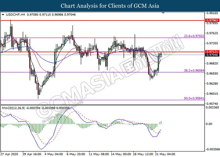 USDCHF, H4: USDCHF was traded higher while currently testing the resistance level at 0.9710. MACD which illustrates bullish bias momentum suggest the pair to extend its gains after it successfully breakout above the resistance level at 0.9710.