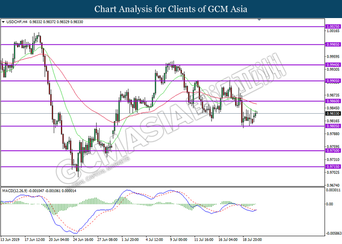 USDCHF, H4: USDCHF was traded higher while currently testing the 20-MA line (green). MACD which display bullish bias signal with the starting formation of golden cross suggest the pair to extend its gains after successfully closing above the 20-MA line.