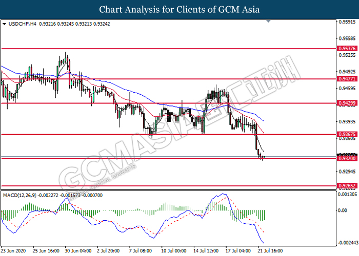 USDCHF, H4: USDCHF was traded lower while currently testing the support level at 0.9320. However, MACD which illustrate diminishing bearish momentum suggest the pair to undergo technical correction toward the resistance level at 0.9365.