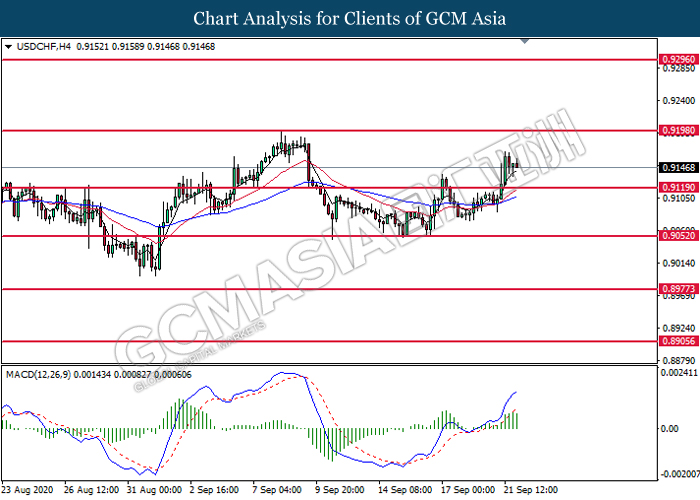 USDCHF, H4: USDCHF was traded higher following prior breakout above the previous resistance level at 0.9120. MACD which illustrates bullish bias momentum suggest the pair to extend its gains toward the resistance level at 0.9200.