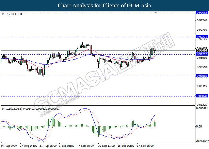 USDCHF, H4: USDCHF was traded higher following recent breakout above the previous resistance level 0.9125. However, MACD which illustrate diminishing bullish momentum signal suggest the pair to experience a short term technical correction back towards the current support level 0.9125.