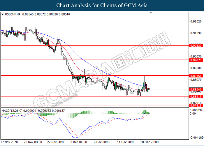 USDCHF, H4: USDCHF was traded lower following prior breakout below the previous support level at 0.8855. MACD which illustrated diminishing bullish momentum suggest the pair to extend its losses toward the support level at 0.8820.