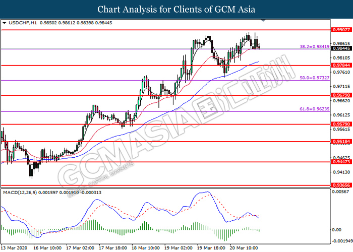 USDCHF, H1: USDCHF was traded lower while currently testing the support level at 0.9840. MACD which illustrate bearish momentum signal suggest the pair to extend its losses after it successfully breakout below the support level at 0.9840.