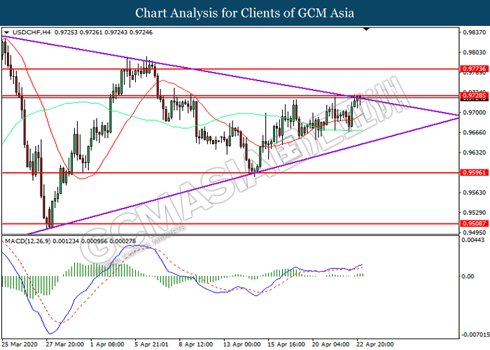 USDCHF, H4: USDCHF was traded higher while currently near the resistance level at 0.9730. MACD which illustrated increasing bullish momentum suggest the pair to extend its gains after it successfully breakout above the resistance level.