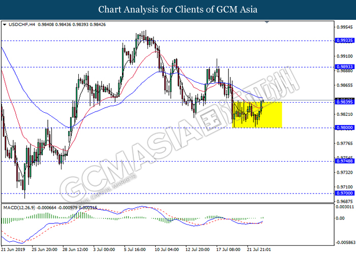 USDCHF, H4: USDCHF was traded higher while currently testing the resistance level 0.9840. MACD which illustrate bullish momentum signal with the formation of golden cross suggest the pair to extend its gains after it breaks above the resistance level.