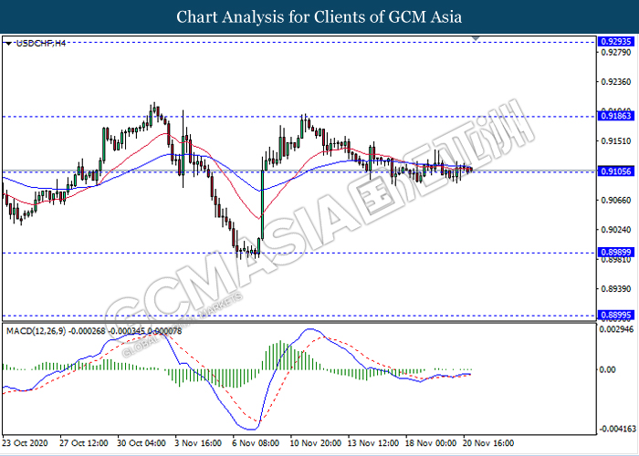 USDCHF, H4: USDCHF remain traded flat while currently testing the support level 0.9105. However, due to lack of clear direction and momentum from MACD, it is suggested to wait until further signal appear before entering the market.