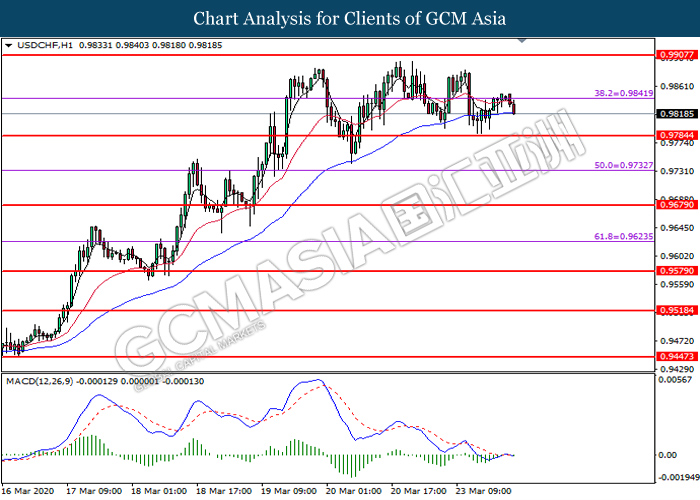USDCHF, H1: USDCHF was traded lower following prior breakout below the previous support level at 0.9840. MACD which illustrate bearish signal suggest the pair to extend its losses toward the support level at 0.9785.