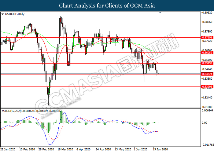 USDCHF, Daily: USDCHF was traded lower while currently testing the support level at 0.9430. MACD which illustrated increasing bearish momentum suggest the pair to extend its losses after it successfully breakout below the support level.