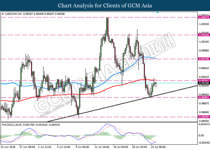 USDCHF, H4: USDCHF was traded higher following recent rebound from the trend line and support level 0.9900. MACD which illustrate diminished bearish momentum and starting formation of golden cross suggest the pair could extend it gains after break above the resistance level 0.9935.