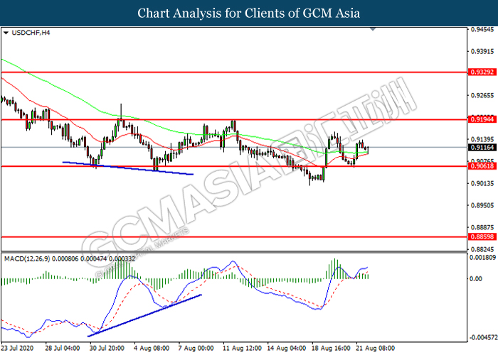 USDCHF, H4: USDCHF was traded higher following prior rebound from the support level at 0.9060. However, MACD which illustrated diminishing bullish momentum suggest the pair to be traded lower in short-term as technical correction.