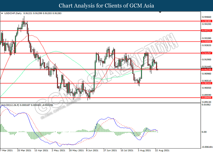 USDCHF, Daily: USDCHF was traded lower while currently testing the support level at 0.9125. MACD which illustrated increasing bearish momentum suggest the pair to extend its losses after it successfully breakout below the support level.