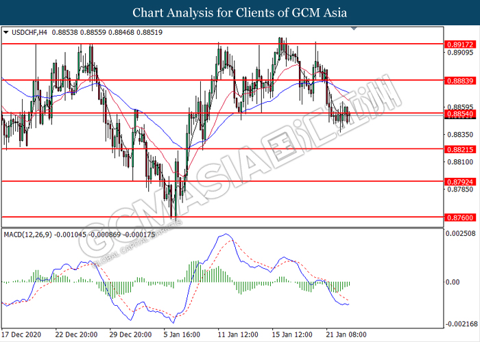USDCHF, H4: USDCHF was traded flat near the resistance level at 0.8855. MACD which illustrated diminishing bearish momentum suggest the pair to be traded higher in short term after it successfully breakout above the resistance level.