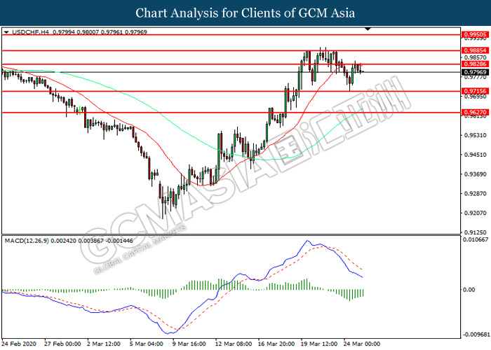 USDCHF, H4: USDCHF was traded lower following prior retracement from the resistance level 0.9830. However, MACD which illustrated diminishing bearish momentum suggest the pair to be traded higher in short-term as technical correction.