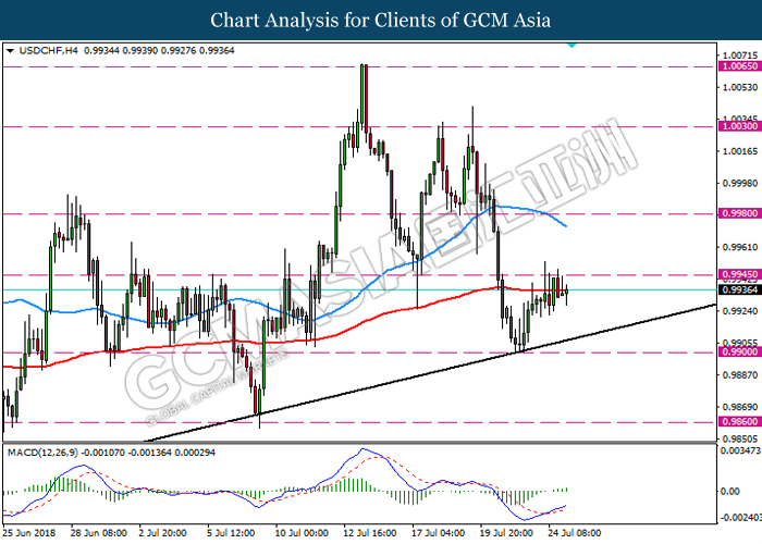 USDCHF, H4: USDCHF was traded higher following prior rebound from the trend line and currently retest the resistance level 0.9945. MACD which illustrate bullish signal with formation of golden cross suggest the pair may extend its gains after it break above the resistance level 0.9945.