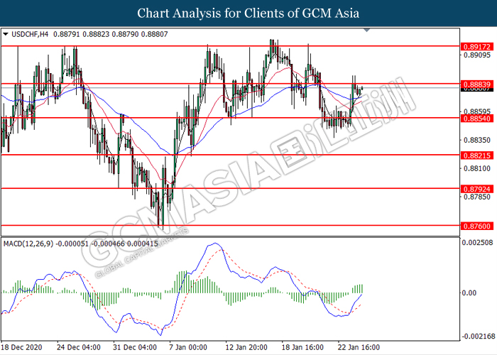 USDCHF, H4: USDCHF was traded higher while currently testing the resistance level at 0.8885. MACD which illustrated bullish bias momentum suggest the pair to extend its gains after it successfully breakout above the resistance level at 0.8885.