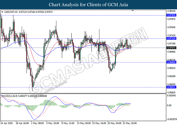 USDCHF, H4: USDCHF was traded higher following prior retracement from the resistance level 0.9730. MACD which illustrate diminishing bullish momentum signal suggest the pair to extend its retracement towards the support level 0.9665.