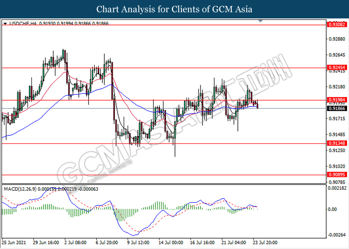 USDCHF, H4: USDCHF was traded lower following prior breakout below the previous support level 0.9200. MACD which illustrate bearish bias signal with the formation of death cross suggest the pair to extend its losses towards the support level 0.9135.