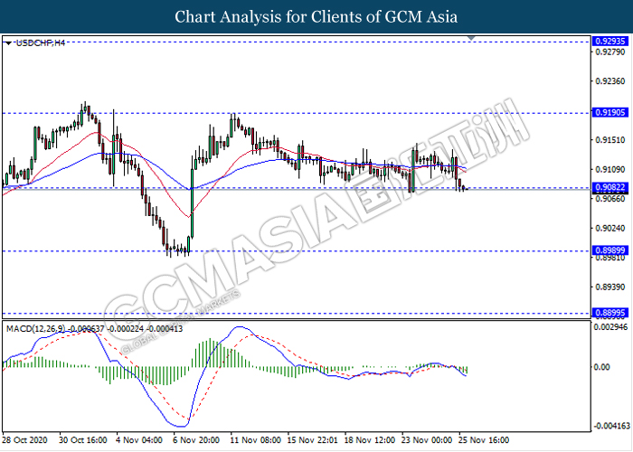 USDCHF, H4: USDCHF was traded lower while currently testing the support level 0.9080. MACD which illustrate bearish momentum signal with the formation of death cross suggest the pair to extend its losses after it breaks below the support level.