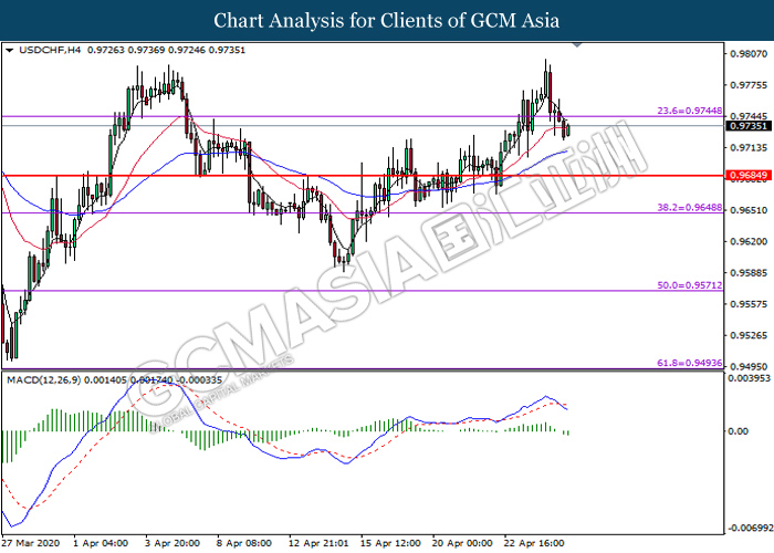 USDCHF, H4: USDCHF was traded lower following prior breakout below the previous support level at 0.9745. MACD which illustrate bearish momentum with the formation of death cross suggest the pair to extend its losses toward the support level at 0.9685.