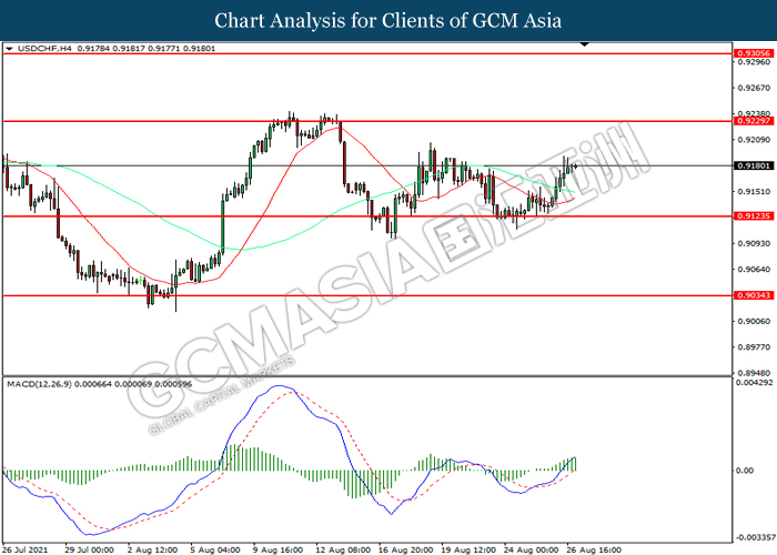 USDCHF, H4: USDCHF was traded higher following prior rebound from the support level at 0.9125. MACD which illustrated increasing bullish momentum suggest the pair to extend its gains toward resistance level at 0.9230.