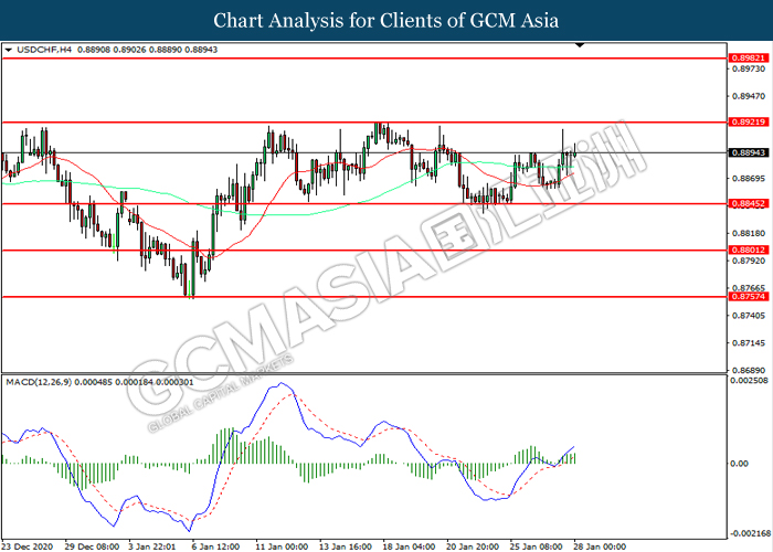 USDCHF, H4: USDCHF was traded higher following prior rebound from the support level at 0.8845. MACD which illustrated increasing bullish momentum suggest the pair to extend its gains toward resistance level at 0.8920.