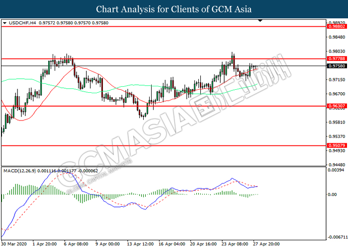 USDCHF, H4: USDCHF was traded higher while currently near the resistance level at 0.9780. MACD which illustrated diminishing bearish momentum suggest the pair to extend its gains after it successfully breakout above the resistance level.