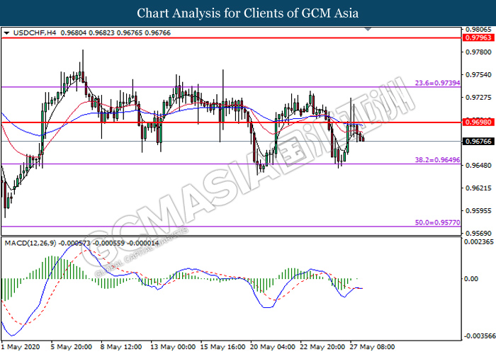 USDCHF, H4: USDCHF was traded lower following prior retracement from the resistance level at 0.9700. MACD which illustrates bearish momentum signal suggest the pair to extend its losses toward the support level at 0.9650.