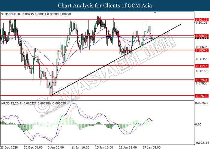 USDCHF, H4: USDCHF was traded lower while currently testing the upward trendline. Namun, MACD which illustrated diminishing bullish momentum suggest the pair to extend its losses after it successfully breakout below the trendline.
