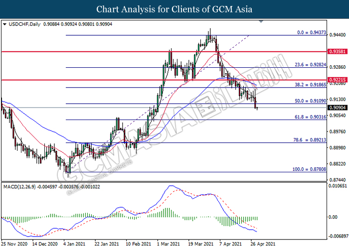 USDCHF, Daily: USDCHF was traded lower following prior breakout below the previous support level at 0.9110. MACD which illustrated bearish bias momentum suggests the pair to extend its losses toward the support level at 0.9030.