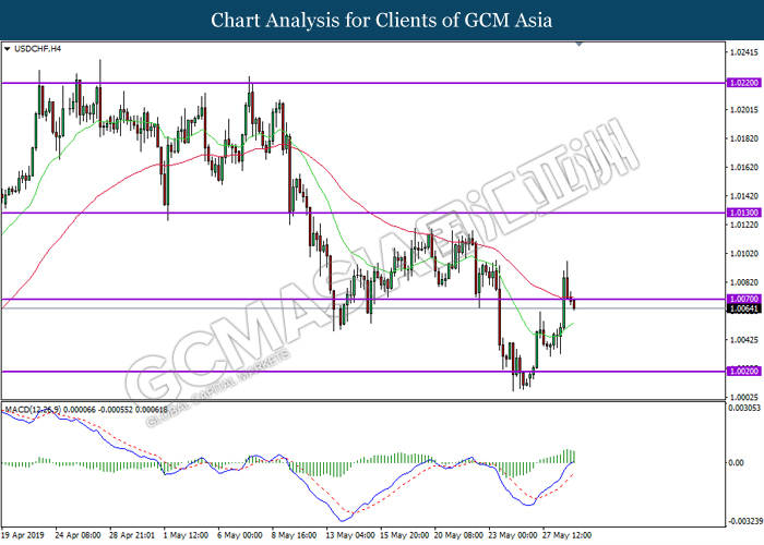 USDCHF, H4: USDCHF was traded lower following prior breakout below previous support level at 1.0070. MACD which illustrate diminishing bullish momentum suggest the pair to extend its losses towards the support level 1.0020.