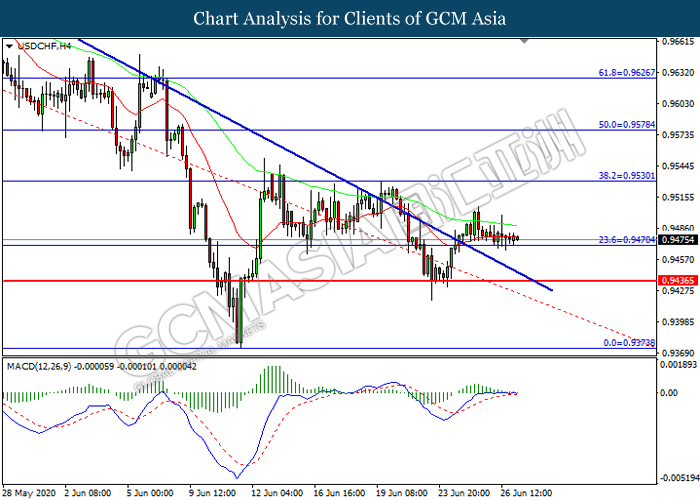 USDCHF, H4: USDCHF was traded within a range while currently testing the support level at 0.9470. MACD which illustrated diminishing bullish momentum suggest the pair to extend its losses after it successfully breakout below the support level.