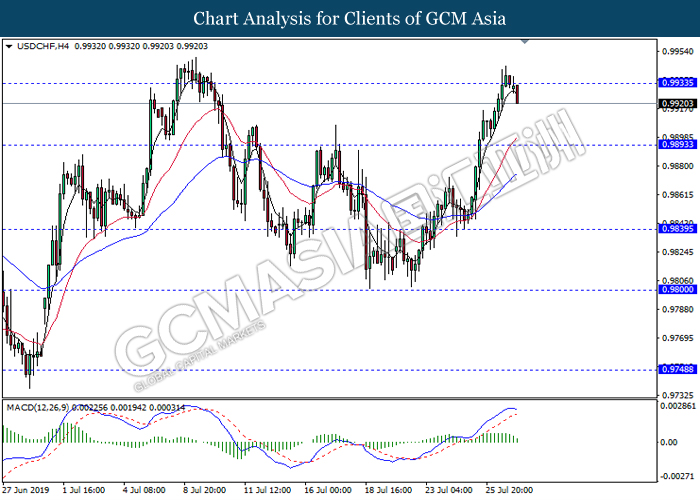 USDCHF, H4: USDCHF was traded lower following prior retracement from the resistance level 0.9935. MACD which display diminishing bullish momentum suggest the pair to extend its retracement towards the support level 0.9895.