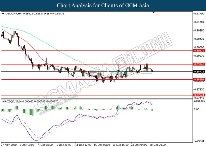 USDCHF, H4: USDCHF was traded lower following prior retracement from the resistance level at 0.8915. MACD which illustrated increasing bearish momentum suggest the pair to extend its losses toward support level at 0.8835.